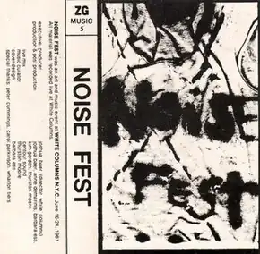 Music from the Noise Festival (aka Noise Fest) was first released on December 15th, 1981 as a 90 minute audio cassette titled Noise Fest on ZG Music; the music label of the legendary ZG magazine organized by Rosetta Brookes.[5] All material was recorded live at White Columns. This included the music of Ut, Lee Ranaldo, Mofungo, Khmer Rouge, The Problem, Smoking Section, Sonic Youth, Jeff Lohn (of the Theoretical Girls), Jules Baptiste's Red Decade, EQ'D, Avant Squares, Don King, Primitives, Ad Hoc Rock, Y Pants, John Rehnberger, Off Beach, Barbotemagus (as it is misspelled on the cover), Economical Animal, Chinese Puzzle, Glorious Strangers, Built On Guilt, Oma Fakir, and Lampshades.[6] The Executive-Producer of the cassette was Joshua Baer. The cassette cover design was created by artist/musician Barbara Ess.
