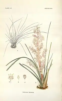 The genus name is a Latinized form of Abbé Pierre Charles Nolin, a French arboriculturist and director of the royal nurseries.[11] The species name is from the state of Texas. Common names include "Texas sacahuiste", "bunchgrass", and "Texas beargrass".[2][12][13]