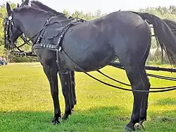 Close linebreeding during the breed's establishment and continued use of a closed studbook have contributed to a recognizable and reliably-transmitted type in the Nonius. The vast majority are black, dark bay or brown, either unmarked or modestly marked with white.[1] Bay individuals are more common among the Nonius horses from Hortobágy National Park.[2] The breed is also known for the heavy but proportional head with a convex profile called either a ram's head or Roman nose.[1][2] The breed exhibits traits common to heavy-boned driving and light draft horses: powerful and arched high-set neck, broad and muscular back, open but powerful loin, deep and sloping hindquarters. The chest is broad rather than deep, and is usually more shallow than the hindquarters. The hooves and joints are large and the legs are dry.[2] Nonius horses stand between 155 to 165 centimetres (15.1 to 16.1 hands; 61 to 65 in). One of the heaviest warmblood driving horses, the ideal Nonius has a girth measurement of 180–210 cm (71–83 in) and a cannon circumference of 22–24 cm (8.7–9.4 in).[1][2] Nonius horses are also known for a kind, even temperament and great willingness and capacity for work both in harness and under saddle.[1] In addition they are usually easy keepers with high endurance.[3]