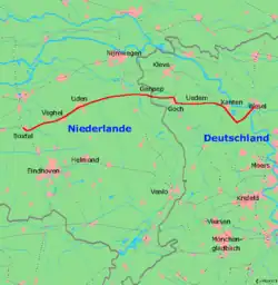 The Noord-Brabantsch-Deutsche Spoorweg-Maatschappij (NBDS) was a railway company undertaking and providing rail transport between Boxtel and Wesel via Uden, Veghel, Gennep, Goch and Xanten. This railway was known in the Netherlands as "Duits lijntje " (German line).[1] On July 15, 1873, the section from Boxtel to Goch could be opened. On July 1, 1878, the second section of the line, the section from Goch to Wesel, could be opened. The total length of the line was 92.7 kilometers, of which 52.7 kilometers on Dutch territory. From Büderich, another 8.2 kilometers of the Köln-Mindener Eisenbahn was used, so was a part of the line from Venlo via Wesel to Haltern, Münster and Hamburg.