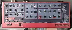 Released in 1995,[1] the original Nord Lead popularized the term "virtual analog synthesis".[2] The phrase was coined by Clavia at the release of the Nord Lead.[3] This synthesizer is distinctive for its red body, knob-laden surface, and unique pitch-stick and modulation wheel. The model received several updates, including the Nord Lead 2, Nord Lead 3, and Nord Lead 2X.