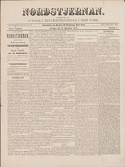 Nordstjernan (in English The North Star), founded in 1872, is a mostly English-language newspaper for Swedish Americans and Swedish citizens in the United States. The publisher is Swedish News, Inc. of New York City.[1]