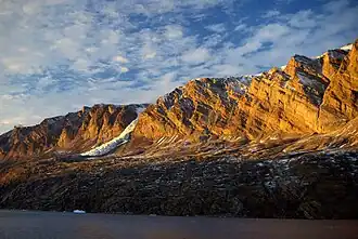 ![]() View of the Daugaard-Jensen Glacier calving area at the head of the fjord. | |