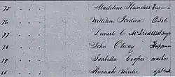 Through the early nineteenth century, both Norfolk (Gosport) Navy Yard and Naval Hospital extensively utilized enslaved labor (see thumbnails 1815 payroll and 1832 hospital muster). On January 2, 1832, in a letter to the Secretary of the Navy, Commodore Lewis Warrington confirmed enslaved labor at the hospital. Warrington stated " I knew that for ten years, that mode has been pursued without complaint or representation against it. In that time several Surgeons attached to the Hospital and several captains in command of the Yard all of whom acquiesced in it."[10] In a January 5, 1832, followup Warrington clarified that the hospital's female enslaved workers and their children had separate sleeping quarters."[In] assigning reasons for the employment of Washers [laundresses] at the Hospital, I omitted to state that they were fixed in an outhouse at a considerable distance from the establishment and had no intercourse with it, but such as was allowed by the medical officer, consequently neither they nor their children could occasion any inconvenience or produce any irregularity."[11][12] Most of the staff took their meals (victualed) at the hospital. The enslaved workers and probably the steward Samuel McFall (white) and doorkeeper William Fell (white) lived on the grounds.[13] At the hospital enslaved African Americans worked in wide variety of occupations as nurses, attendants, hospital cooks, washers/laundresses, boatmen and gravediggers. In 1832 Madeline Flanders (see thumbnail) was the first woman listed as a hospital nurse.[14]