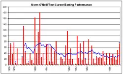 O'Neill responded during the 1957–58 Sheffield Shield season weakened by the absence of the Test players, aggregating 1,005 runs at 83.75 and taking 26 wickets at 20.42 with his leg spinners, thus topping the national bowling and batting averages.[6] Prior to the season, he had never taken a first-class wicket.[7] In the opening match of the summer, he took 3/74 against Queensland. He then took a total of 5/51 scored 33 and 48 not out in a six-wicket win over Western Australia before taking 3/52 and adding two fifties in the return match.[7] He then broke through for his first century of the season, scoring 114 and taking 3/44 in a ten-wicket win over South Australia.[7] However, he reached more productive levels in the second half of the season.[7]