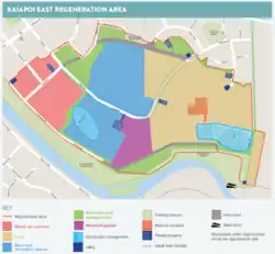 The next major development in the genesis of Norman Kirk Park took place on 15 June 2018 when the Crown officially returned the Waimakariri District residential red zone to local control by selling the land to the Waimakariri District Council for $1 and an agreement that any future profits from the land must be shared with the Crown.[16][17] The Waimakariri District Council released a document entitled ‘Draft Reserves Master Plan: Kaiapoi Regeneration Areas’ in September 2018 which mapped out the sports fields, stormwater area, dog park, and BMX track that later formed Norman Kirk Park. This document explained that the Waimakariri District residential red zones would no longer be referred to as ‘red zones’ as they were now ‘regeneration areas’.[4] Old roads and other infrastructure were removed from the further Norman Kirk Park site in October 2018 and construction began for the creation of the sports fields and Beswick stormwater area.[11]