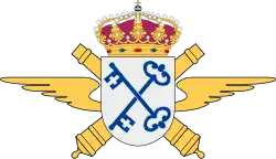 The unit standard was presented to the then Royal Luleå Anti-Aircraft Corps (Lv 7) in Luleå by the commander of the VI Military District, Major General Nils Roslund in 1943.[11] It was used as unit standard by Lv 7 until 1 July 2000. The standard is drawn by Brita Grep and embroidered by hand in insertion technique by the Kedja studio, Heraldica. Blazon: "On blue cloth in the centre the lesser coat of arms of Sweden, three open yellow crowns placed two and one. In the first corner the town badge of Luleå; two white keys, the left inverted (the original name of the battalion was Luleå Anti-Aircraft Corps). In the other corners two winged yellow gunbarrels of older pattern in saltire. Yellow fringe."[11]