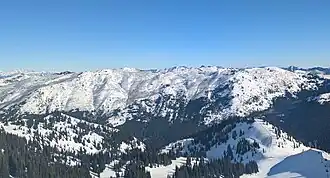 From the summit, Mount Rainier, Mount Adams, Mount Stuart, Glacier Peak, the North Cascades, Mount Baker, and the Olympic Range can be seen on a clear day.[5][6] The Crystal Mountain ski resort is located nearby, and both areas are accessed from the same road leading off of State Route 410.[2] In summer, the resort offers a gondola ride that features views of Norse Peak.[5][2] The summit was the site of a now decommissioned fire lookout. In the summer and early fall, Norse Peak is snow-free and can be accessed via trail 1191, which has been rerouted to prevent erosion. The Pacific Crest Trail passes just to the east of the peak.[7][8] Described as dry and dusty,[5] the hiking trail gains 2,800 feet (850 m) in 10.8 miles (17.4 km), and allows dogs and horses but has no water sources.[8][9][2] The trail continues south near the ridgeline from Norse Peak and connects to the Bullion Basin trail.[9] In the summer, there can be wildflowers as well as wildlife such as elk and mountain goats;[2] in winter, the peak can be accessed via snowshoe or backcountry skiing, but carries a risk of avalanches. People who are ski touring can leave from the Crystal Mountain parking lot, with a roundtrip distance of 7 miles (11 km) to the summit.[1][10] The Norse Peak Wilderness is bounded on the west by the north-south ridgeline that includes Norse Peak.[8] The Norse Peak wildfire ignited in a lightning strike on August 11, 2017, and continued into late September, burning over 52,000 acres (21,000 ha) on the mountain and surrounding areas.[11][12] The mountain is also the namesake of the Mountain Hardwear Norse Peak Hoody, a fleece jacket described by GearLab as "great for hanging out around the fire or chilling at the crag".[13]