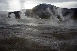 The eastern parts of this region lie within the higher ranges of the Andes and include a large district. This arid, bleak area is apparently a continuation southward of the great Altiplano, and is known as the Puna de Atacama. Its average elevation is estimated at 11,000 to 12,000 ft. A line of volcanoes crosses it from north to south, and extensive lava beds cover a considerable part of its surface.[1] The chief summits being those of Licancabur, Acamarachi, Láscar, Miñiques, Pular, Socompa, Llullaillaco. Large shallow saline lakes are also characteristic features of this region.[1] The area receives considerable rainfall during the summer months in what is commonly known as the Bolivian Winter, forming shallow lakes of mostly saline waters that are home to a number of bird species, including the flamingo species Andean, Chilean and James.