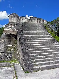 Temple 26 (Structure 5D-26) is the central building in the North Acropolis, located centrally on the south side of the basal platform overlooking the terrace; the earliest version of this structure dates to approximately 250 CE. Temple 26 has been fully excavated and restored.[18] A tomb in the structure was looted at some time during the Postclassic period.[19] The northern portion of the structure stood over a Late Preclassic tomb (Burial 85) dated to around 100 CE, which has been tentatively identified as that of dynastic founder Yax Ehb' Xook.[20]