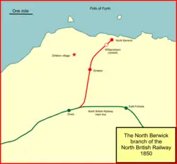 To head off this threat, the Directors of the North British Railway set about getting authorisation for branch lines to several places adjacent to their main line, to pre-empt the rival incursion. In addition, North Berwick was judged to have the potential for the construction of superior residential districts for Edinburgh merchants, who might travel daily to their place of business, by train. A special shareholders' meeting held on 9 February 1846 approved four Bills to go to Parliament for branch lines; one of these swept up branches to Duns, North Berwick, Tranent and Cockenzie; estimated capital required was £170,000.[2] On 16 June 1846 the Royal Assent was granted to a North British Railway Act for the branch lines, including one to North Berwick from Drem. At North Berwick the line was to extend through the town a far as the harbour.[3][4]