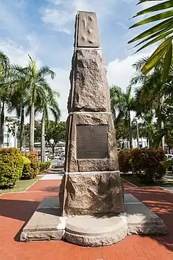 The monument was originally erected in Bond Street (now Gaya Street), and was later moved to Jalan Pantai (formerly Neil Malcolm Street).[2] Due to the shifting of the KK City Park in the 1970s, the monument had undergone changes in form and height. In addition, the bronze plaque on the obelisk and a plaque at the site of previous gun were extended.