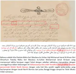 - ^ The Confirmatory Deed of 1903 must be viewed in the light of the 1878 Agreement. The British North Borneo Company entered into a Confirmatory Deed with the Sultanate of Sulu in 1903, thereby confirming and ratifying what was done in 1878.