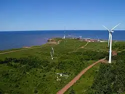 The North Cape Wind Farm is a small 16-turbine wind farm located at North Cape in the community of Seacow Pond, immediately south of the WEICan facility. The wind farm was developed in two 8-turbine phases with phase one being completed in November 2001 and phase two being completed in November 2003. The wind turbines being used are the Vestas V-47-660 model with a rated generating capacity of 660 kWh (2,400 MJ).[12] At 100% production, the 16 turbines are capable of generating 10.5600 MWh (38,016 MJ) of electrical power per year.[13]