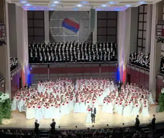 Every year young women from around North Carolina, usually in their freshman or sophomore year of college, are nominated to be presented at the ball.[9] Members of the Terpsichorean Club make the final selection of candidates. The women are selected from families who have made economic, social, cultural, or civic contributions to North Carolina.[6] A "lead debutante" is selected every year from Wake County, as the seat of the state capitol.[6] The ball weekend, still during Labor Day weekend, includes eight functions.[10] Prior to the ball, a father-daughter luncheon is held at Angus Barn, an upscale steakhouse.[11] The formal presentation of debutantes takes place at Meymandi Concert Hall in the Martin Marietta Center for the Performing Arts in downtown Raleigh and the ball is held at Carolina Country Club.[6][12]