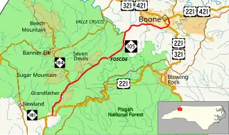 The first four miles (6.4 km) of the highway are two-lane and go by the gated communities Grandfather Golf & Country Club and Linville Ridge. At the Tynecastle intersection in Linville Gap, it crosses the Eastern Continental Divide and begins to descend into a valley area. On this section of the highway, the south-bound traffic has a passing lane and trucks are required to drive 45 miles per hour (72 km/h). Once the descent ends, the route briefly passes through the town limits of Seven Devils. Between Seven Devils and Broadstone Road is the unincorporated community of Foscoe. Some of the best views of Grandfather Mountain can be seen at this section of the highway for southbound traffic; it is also notorious for traffic back-ups by travelers trying to stop and visit shops on either side of the road. A brief southbound passing lane is available near Hound Ears. Between Broadstone Road and NC 105 Bypass, the highway ascends towards Boone, and the north-bound traffic expands to two lanes. A rock quarry and asphalt plant are located along the road through here. In Boone, the highway becomes a full four-lane highway for the rest of the route and connects to two major roads: Blowing Rock Road and East King Street.[1][2]