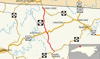 North Carolina Highway 113 (NC 113) is a primary state highway in the U.S. state of North Carolina. It runs from NC 18 in the community of Laurel Springs, to NC 93 in the community of Piney Creek.
