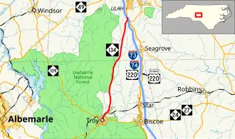 NC 134 is a predominantly two-lane rural highway that begins in downtown Troy at the intersection of North Main Street and East Main Street. Going north, it travels next to Denson Creek Golf Course before becoming the eastern edge of the Uwharrie National Forest. A couple of times the national forest goes over the eastern side of the road but not many. At Beane Country Road, the Uwharrie Forest finally goes west of the road as the road continues north. At Dawson Miller Road, NC 134 ends, just 600 feet (180 m) from the I-73/I-74/US 220 interchange.