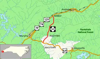The entire 8.7-mile (14.0 km) length of NC 141 is contained within Cherokee County. The southern terminus of the highway is at U.S. Route 64 (US 64) between Murphy and Hayesville (north of the community of Brasstown). Its northern terminus is at US 19/US 129/US 74 and Marble Road in Marble.