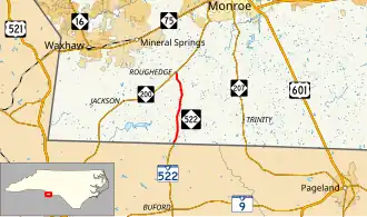 North Carolina Highway 522 (NC 522) is a primary state highway in the U.S. state of North Carolina. The highway runs north–south from the South Carolina state line, near Sapps Crossroads to NC 200 in Roughedge, entirely in Union County.