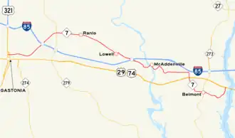 NC 7 Truck is a short 1.7-mile (2.7 km) route that overlaps entirely with US 29 and US 74 through Belmont. The truck route was established to keep trucks from traveling through downtown Belmont. The eastern terminus is also the end point of NC 7.