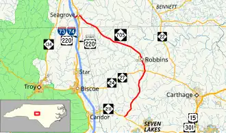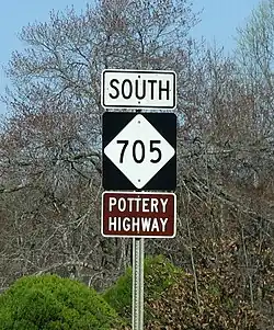 North Carolina Highway 705 (NC 705) is a primary state highway in the U.S. state of North Carolina. The route is marked as the Pottery Highway or Pottery Road and as a North Carolina Scenic Byway[2] due to the large number of potters in and surrounding Seagrove.