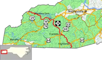 NC 28 starts at the Georgia state line in Macon County. From the state line, it follows a winding course northwards to Highlands. There it begins a 14-mile (23 km) concurrency with U.S. Route 64 (US 64) on the way northwest to Franklin. Following an interchange with US 23 and US 441, the US 64 concurrency ends and enters the downtown business district of the city. NC 28 forms a concurrency with US 441 Business on the one-way pair of Main Street and Palmer Street. The two roads cross the Little Tennessee River before NC 28 breaks off and heads north out of the city on Harrison Avenue.[1] Though the official routing of the highway is along Harrison Avenue, signage shows NC 28 traveling along Depot Street and Riverview Street bypassing the city downtown.[3]