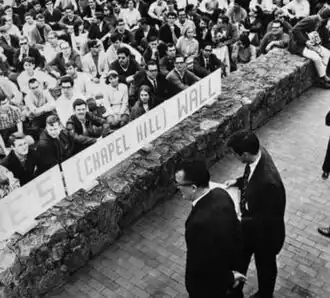 After the bill had become law, many students, faculty, and administrators actively opposed the ban, seeing it as an attack on freedom of speech. In order to challenge the law, students at the University of North Carolina at Chapel Hill led by student body president Paul Dickson invited Herbert Aptheker and Frank Wilkinson to speak on the edge of the campus. As expected, the university refused to allow either of the speakers to give their speeches on campus. Instead, they addressed the assembled crowd from across the stone wall that separates the university from the town of Chapel Hill.[2] At the request of Godwin, North Carolina Attorney General T. Wade Bruton issued a formal advisory opinion on the law in August 1963, concluding it to be constitutional.[3]