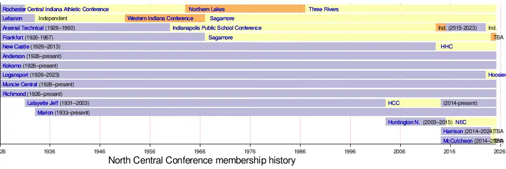 New Castle elected to leave the NCC at the beginning of the 2013-2014 school year. They joined the Hoosier Heritage Conference in 2014.[3] Huntington North left the NCC at the conclusion of the 2014-15 season to become a member of the Northeast Hoosier Conference. Lafayette Jeff rejoined the conference in 2014, bringing along fellow county schools Harrison and McCutcheon. Indianapolis Arsenal Tech rejoined the NCC as of April 1, 2015, but due to travel concerns, it will exit the conference at the end of the 2022-23 school year.