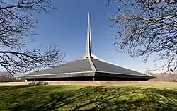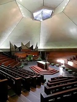 The church is significant for its progressive and oft-copied design. Set on 13-acre (5.3 ha) grounds designed by Dan Kiley, the building is hexagonal in shape, with a central metal spire that is 192 feet (59 m) high.[3] Below the spire, there is an oculus that admits light into the main level. The sanctuary, whose interior is designed by Alexander Girard, is located at the center of the building. Rows of pews surrounded the centrally-placed communion table. The lower level contains classrooms, an auditorium, a kitchen, and an activities area.[4]