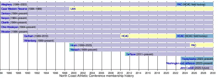 The most recent changes to the NCAC membership were announced in 2024. First, on January 18, John Carroll University announced it was leaving the Ohio Athletic Conference to join the NCAC.[2] Then on April 23, Hiram announced it would leave the NCAC in 2025 to return to the PAC, which it had left in 1989.[3]