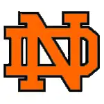 The school's athletics logo is an interlocking "ND" in orange, black, and white colors. It is copied from the University of Notre Dame athletics logo. Other NDHS logos feature black knights riding upon a horse in armor.
