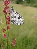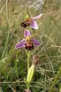 Chalk grassland is found on the steep south-facing scarp slopes and the more gently graded north-facing dip slopes, where woodland is absent. The alkaline soils are thin and nutrient poor, which prevents deeper-rooted lush grasses (with a high water demand) from dominating.[20] Each square metre of chalk downland may support up to 40 different species. This semi-natural habitat is maintained through sheep, cattle and rabbit grazing which prevents scrub encroachment. Chalk grassland to the west of the Medway Valley is dominated by upright brome and fescue, whilst grassland to the east is dominated by tor-grass.[1] Owing to the close proximity of the North Downs to the European continent, the warm climate and the south-facing escarpment, several plant species survive on the chalk grassland which are scarce or not found elsewhere in the British Isles.