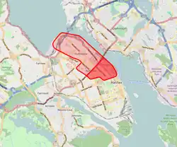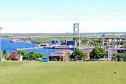The area once included historic Africville. A former African-Canadian community settled by African slaves coming to Canada, it was located on the shores of the Bedford Basin within the North End. A consequence of the Halifax Explosion, the community was damaged on 6 December 1917. In January 1964, the City Council of Halifax voted to relocate the residents of the community.[6] The municipal government justified the destruction of Africville by citing the poor living conditions of the community, despite having historically refused to extend those services to the community.[7][8] The community was torn down in the 1960s preceding a proposed urban redevelopment of the region which would see new highways and the construction of the A. Murray MacKay Bridge, although the lands of the community were never used in a proposed port expansion. In the ensuing controversy it was designated as parkland.[7] The Africville expropriation is often characterized as an example of institutional racism in Halifax.[9] Descendants and residents of Africville were dispersed among some of the North End's public housing projects, as well as into other communities throughout the urban area, and beyond.[10] Seaview Park on the Bedford Basin is the site of Africville