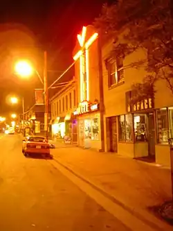Gottingen Street is the commercial and entertainment heart of the North End, and is home to numerous shops, bars, clubs, and performance venues. In 1950, the four blocks of Gottingen closest to downtown were the site of more than 130 enterprises, including two cinemas.[26] The street declined in stature as the peninsula lost population during the latter half of the 20th century, and as a result of car-oriented urban renewal schemes.[28] Many nearby residences were demolished when the northern part of Barrington Street was transformed into a highway to serve the Macdonald Bridge, and when the Cogswell Interchange was built. In 1958, several blocks of houses and apartment buildings were demolished in an attempt to boost patronage on Gottingen by providing additional car parking. Seven new parking lots were built, displacing local residents to other areas, but according to a Dalhousie University study, this had "no positive impact on the vitality of the Gottingen Street commercial district".[29]