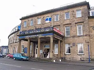 The hotel is built of ashlar with slate roofs.[6] It has a curved plan, with a front façade that stretches approximately 300 yards (270 m).[16] The north and south wings have two regular storeys with a mansard roof, and dormers providing accommodation on the third floor. The central portion has three full storeys. The north wing, which faces along the Esplanade, curves almost a full 90 degrees, while the south wing is shorter, curving roughly 45 degrees. At the front of the building there is a porte-cochère (porch) supported by fluted Roman Doric columns.[17]