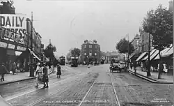 In 1905. the Metropolitan Electric Tramways (the M.E.T.) opened a tramline between Highgate and Whetstone and this was crossed by another from New Southgate to Golders Green from 1909. To facilitate this a tramway depot was opened in Woodberry Grove. Trams combined with motorbus services promoted the development of the retail district we see today. During the 1930s the old Ballards Lane, which terminated where the Embassy Lounge (formerly called the Purple Rain Bar, before that the Cherry Tree and previously the Coach Stop) is today, was replaced by a new road called Kingsway. In 1937 the new plot created by this diversion became the location for the Gaumont Cinema. This was demolished in 1987 to be replaced with the recently opened Arts Depot.