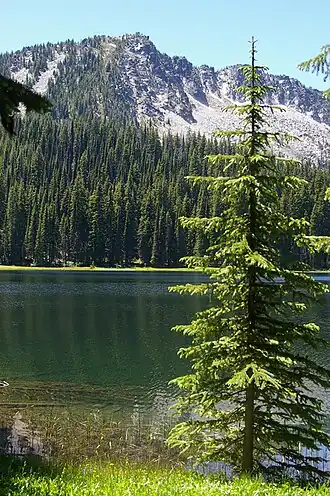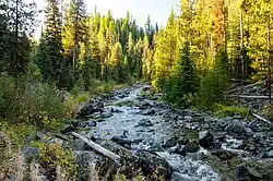 The North Fork John Day Wilderness is composed of rolling benchlands, steep ridges, alpine lake basins, and the granite outcrops of the Greenhorn Mountains at an elevation of 8,100 feet (2,500 m). It encompasses two entire subranges of the Blue Mountains—the Greenhorn Mountains and the ragged Elkhorn Mountains.[3] A continuous vegetative canopy covers most of the land, including dense virgin stands of conifer species like Douglas-fir, white fir, western larch and lodgepole pine.[2] The headwaters of several waterways are located in the wilderness, including Bull Creek, Baldy Creek, and Crawfish Creek, as well as the North Fork John Day River, 39 miles (63 km) of which are designated Wild and Scenic.[2][3]