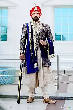 Traditional outfit for a North Indian groom with the turban style varying from region to region and absent in some parts, notably Bengal.