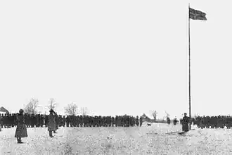 Elfvengren's hopes of causing a diplomatic incident and causing a wider rebellion amongst Finns and Ingrian Finns in the area had failed terribly.[6] Having performed an attack without the prior approval of the Finnish Government, Elfvengren was sacked and replaced by Elja Rihtniemi.[1] Elja Rihtniemi began to construct fortifications in Lempaala and requested weapons from Finland, Rihtniemi would resign two months later, and Elfvengren would be re-hired. Elfvengren began to get back on the offensive in accordance with Nikolai Yudenich of the White Army, this deal with the White Movement helped Kirjasalo receive four observing officers from the Northwestern Army, and receive much-needed financial assistance leading to the building of a hospital and other key infrastructure.[6] Yudenich had signed a deal with Elfvengren for the purpose of getting him to join a planned attack on St. Petersburg.[1]