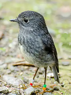 The North Island robin (Petroica longipes; Māori: toutouwai, pronounced [ˈtoutouwai])[2] is a species of Australasian robin endemic to the North Island of New Zealand. It and the South Island robin (P. australis) of the South Island and Stewart Island were once considered conspecific (and called the "New Zealand robin"), but mitochondrial DNA sequences have shown that the two lineages split prior to the Pleistocene, and support the classification as two different species.[3]