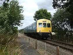 Starting from Sheringham station, the lines follows the coast westwards, soon passing over the Automatic Open Crossing at Sweetbriar Lane, where the private road leading to Sheringham Golf Club crosses the line.[35] The line climbs a 1 in 97 gradient, with the golf course, and Skelding Hill,[36] on the seaward side of trains, while the A149 can be seen on the landward side of trains, roughly paralleling the tracks with Upper Sheringham visible in the distance. During WW2, Skelding Hill was the location for an emergency coastal battery, complete with an underground headquarters bunker.[37]