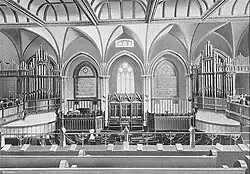 The church was Romanesque in style, of bluestone, 91 by 66 feet, with a tower projection of four feet (making the depth 95 feet). It had a slate roof with eaves 41 feet, and a ridge 62 feet, above the pavement, and a central wooden spire 182 feet high. The interior was finished in fresco and furnished with an organ from Jardine and Son. There were 152 pews on the main floor and 60 in the two side galleries with a disconnected organ gallery in front. The house was lighted at night from the ceiling. The capacity was 1,000 and the total cost, with the organ and other furniture, was $45,759.28.[22][30]