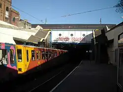The Newcastle and North Shields Railway opened in 1839. In 1847, the railway was extended to Tynemouth when a railway station was built in Oxford Street, off Tynemouth Road. Eventually, it was replaced by a new station further away from the river after new rail lines were developed.[44] The riverside tracks were removed for the creation of Hadrian's Way, part of the national cycle network, but the remaining tracks were absorbed in the Tyne and Wear Metro system in 1982. The town centre station, originally constructed for the Newcastle and North Shields Railway, was redeveloped between 1980 and 1982 for the Metro. It was subsequently refurbished in 2012.[45] The Tyne and Wear Metro links North Shields to Newcastle city centre, and to other destinations in Tyne and Wear including Whitley Bay, Newcastle Airport and Sunderland. The town is also served by stations in Percy Main and Meadow Well.