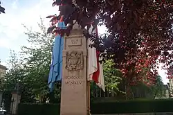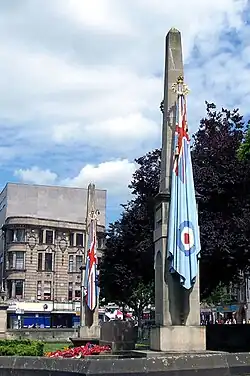Each obelisk sits on a tall, four-tiered rectangular column which itself stands on a wider, undercut square plinth. The obelisks and their supporting columns are ornately decorated. A narrow cross is set into the obelisks while the town's coat of arms is moulded onto the columns; the columns contain deep decorative niches, forming an arch shape beneath the obelisks. Obelisks feature in several of Lutyens's war memorials, though only Northampton's and Manchester's use a pair of flanking obelisks (in Manchester's case, the obelisks flank a cenotaph, rather than a stone); both are particularly fine designs in which Lutyens uses the obelisks with "dignity and simple dramatic effect", according to historian Richard Barnes.[12][13] The obelisks are inscribed with the dates of the First and Second World Wars in Roman numerals (the inscriptions relating to the Second World War were added at a later date).[2][8][9][14]