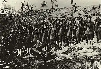 Officer training was provided as an accelerated training course for 6 months in accordance with the urgent needs of the time, and its contents included mental education, history, military science, martial arts (weapons and unit command and operation), gymnastics, and rules and regulations. In particular, history education was aimed at cultivating national spirit by focusing on the history of independence of countries around the world and the history of Japan's invasion of Joseon. Military education was conducted based on the military methods of the former Korean Empire, and thorough military training was conducted at two parade grounds within the headquarters. Live-fire shooting practice was conducted against a model of the Imperial Japanese Military, and people from the Chinese military or Russian military academies were invited as instructors. In June 1920, out of 600 men who completed basic training, only 300 went into full-scale military training wearing gray military uniforms. In addition to military training, Gunjeongseo not only cooperated with independent movement organizations in Noryeong and Gando, but also served as a contact center for independence activists in northern Manchuria. While paying attention to local administration, elementary schools, night schools, and training centers were established, while promoting convenience in local industries.[1] The first Officer Training Center graduation ceremony was held on September 9, 1920, and 298 officers were graduated. Among them, 80 were appointed as second lieutenants, and the Gyoseongdae (Gyoseongdae, or Yeonsungdae) was organized around the remaining 200 people. This unit was the most elite unit and later played a leading role in leading the Battle of Cheongsanri to victory.[5][8][7]