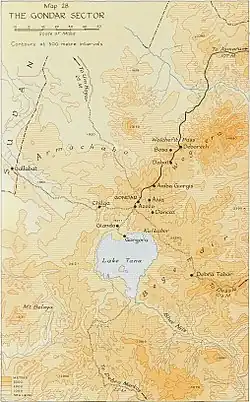 The brigade patrolled to deny the fort to the Italians and on 9 November, two Baluch companies attacked, held the fort during the day and retired in the evening. During the night, an Italian counter-attack was repulsed by artillery-fire and next morning the British re-occupied the fort unopposed. Ambushes were laid and prevented Italian reinforcements from occupying the fort or the hills on the flanks, despite frequent bombing by the Regia Aeronautica.[34] The brigade re-occupied the ridge three days later but made no attack on Metemma.[37] The caravan routes into Ethiopia needed to supply the Arbegnoch ("Patriots", Ethiopian irregulars supported by the British) and by Gideon Force remained under Italian control. For two months, the 10th Indian Brigade and then the 9th Indian Brigade simulated a division, the slouch hats of The Garhwal Rifles being taken as a sign that an Australian division had arrived.[38] The brigades blazed communication trails eastwards 80 mi (130 km) from Gedaref and created dummy airfields and stores depots, to convince Italian military intelligence that the British offensive from Sudan would be towards Gondar in the south and that the attack at Kassala into Eritrea was a bluff.[39]