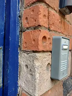 Holes bored in the walls by children queuing for the Sunday School using pennies, halfpennies and farthings