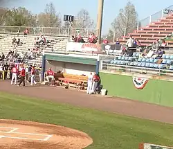 The fences at Pfitzner Stadium are 315 feet down the lines and 400 feet to straight-away center field. There is an electronic scoreboard in left-center field capable of displaying images as well as some video. The dugouts at the stadium are unusual in that they are located at field level, and prior to 2018 there was no fence or rail separating them from the field. However, as part of renovations completed following the 2017 season, netting was added in front of both the home and visiting dugouts.[5]