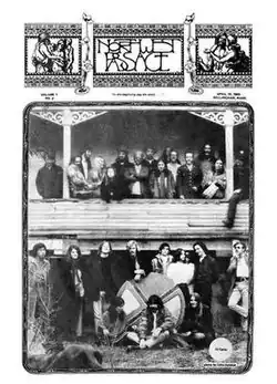 ![]() Cover of Northwest Passage vol. 1, no. 2 (April 10, 1969) issue. Photo showing members of the local "freak" community, including Northwest Passage staffers. Frank Kathman is the tall, mustachioed man in the upper right. | |